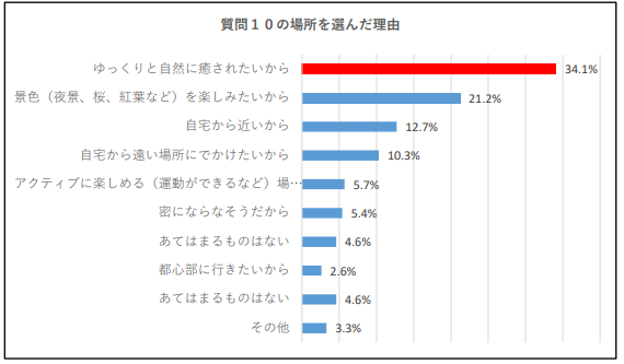 ドライブスポットを選んだ理由として、最も多いのは「ゆっくりと自然に癒されたいから」で34.1%、次に多い理由は「景色(夜景、桜、紅葉など)を楽しみたいから」で21.2%と、ドライブに行く目的として、美しい自然や景色に癒されたいという方が多いことが分かりました。
