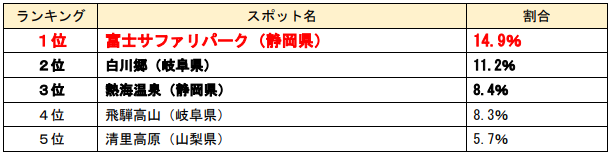 中部地方で人気のドライブの行き先は1位が「富士サファリパーク(静岡県)」、2位が「白川郷(岐阜県)」、3位が「熱海温泉(静岡県)」でした。