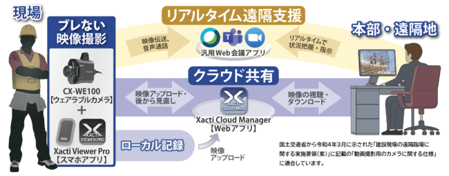 現在、建設業界では深刻な人手不足の影響から、業務の効率化・生産性の向上やコスト削減など多くの課題があります。今回、本格レンタルを開始する「ウェアラブルカメラ」は、様々な汎用Web会議システムを介して、現場の作業員が映す現場映像を遠隔地にいる管理責任者側がリアルタイムで視聴することができます。カメラは高画質かつ強力揺れ補正機能が搭載されているため、管理責任者はストレスなく現場映像を見ることが可能です。これにより、管理責任者は実際に現場に赴く必要がなく、生産性の向上が期待できます。また、管理責任者側が遠隔地から必要に応じた指示をすることでき、技術面を支援するとともに、業務の効率化を実現します。