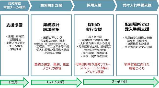 本サービスは、これまで100社以上の障害者雇用支援コンサルティング実績を有する専任のコンサルタントが企業に常駐し、業務設計から職域開拓、母集団形成、採用準備、受け入れ準備における事務を代行します。