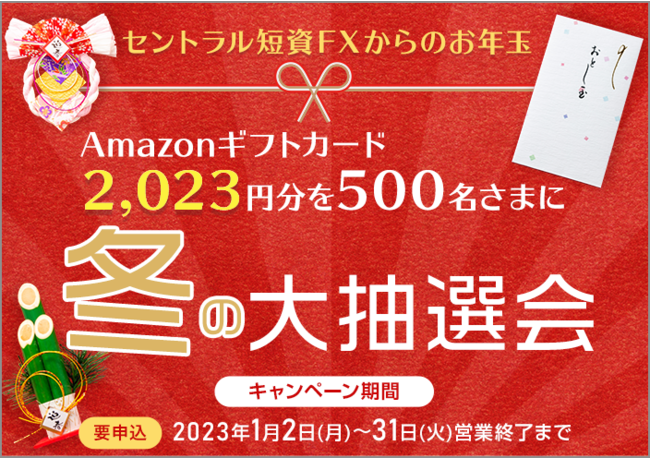 セントラル短資FX株式会社(本社:東京都中央区、代表取締役社長:松田 邦夫)は、2023年1月31日までAmazonギフトカード2,023円分を抽選で500名さまにプレゼントするキャンペーンを実施します。