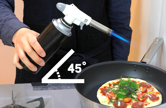 なお、大きく傾けたまま長時間使用し続けるとバーナー部などが熱で損傷するおそれがあります。取扱説明書に指示がある場合を除き、使用中の傾ける角度は45度までを目安としてください。