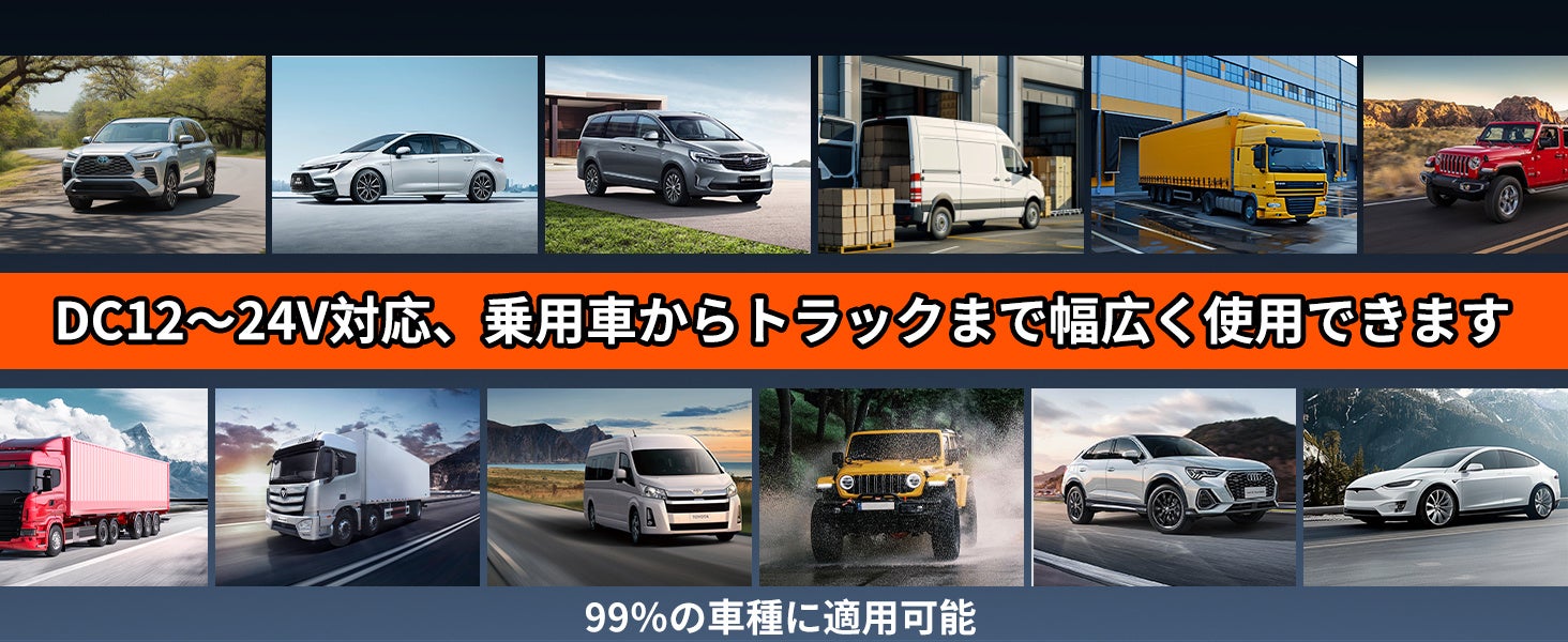 DC12〜24V対応で、乗用車からSUV・ミニバン・バン・トラックまで幅広く使用可能。