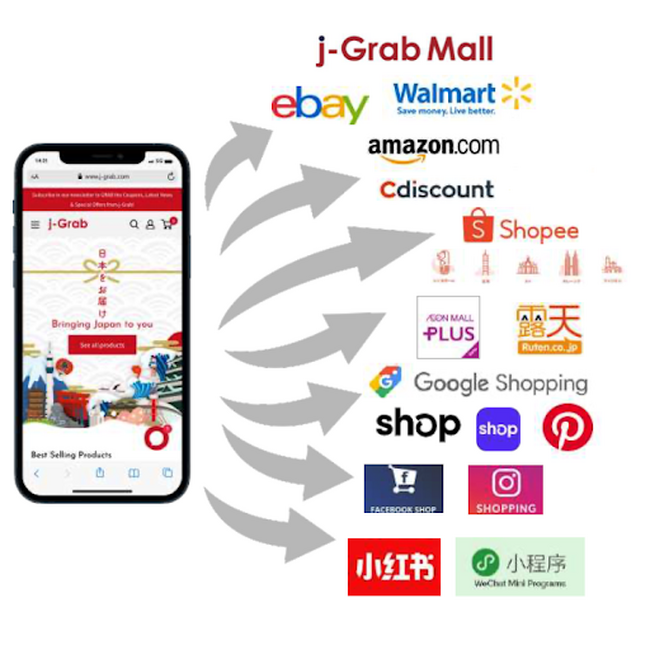 j-Grab Mallは大手海外主要ECマーケットプレイス eBay、Amazon、Walmart、Shopee、Ruten、AEON MALL PLUSをはじめ、Facebook Shop、Instagram Shopping、 Google Shopping、Shopアプリなどと連携しており、j-Grab Mallに出店するだけで世界中のECプラットフォームで海外販売できます。