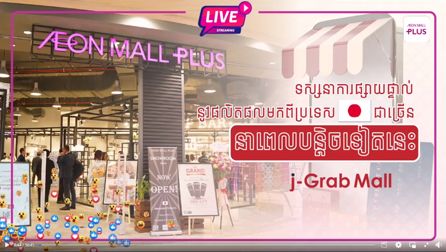 ジェイグラブ株式会社(本社:東京都渋谷区、代表取締役:山田彰彦、以下「ジェイグラブ」)が運営する越境ECモール「j-Grab Mall」の常設ショールームストア イオンモール ミエンチェイ店(カンボジア王国)にて5月20日、ライブストリーミング販売にて、j-Grab Mall商品を紹介され大盛況に終わりました。今後も継続してライブ販売を行ってまいります。