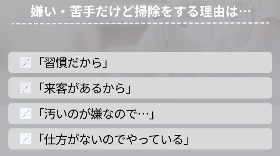 レイコップ株式会社では、2025年10月7日〜10月17日間に、1,795名の男女を対象に「掃除に関する意識調査」を実施。アンケート結果より、掃除を好んで実施しているのはわずか25%。その他の多くの人が掃除を苦手・面倒と感じているが、その反面、掃除を行う頻度として、「毎日」という回答が最多。掃除を行う理由としては「習慣だから・汚れている(乱れている)のが嫌だから・来客があるから」など、義務感や必要性に駆られて行っていることが伺える。また、掃除=面倒という意見が多い反面、掃除後の「爽快感」を好む意見も多く見られ、《キレイになる・汚れがなくなる》ことでの気持ちよさを実感していることから、掃除を行う“前後”での気持ちの変容がみられた。