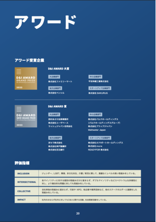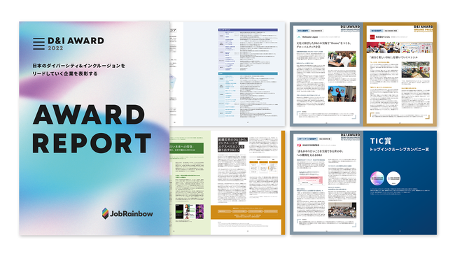 「D&I AWARD 2022 アワードレポート」では、認定企業の一覧や、受賞企業17社と認定企業1社の取組み紹介記事を盛り込んでおり、D&I推進リーディング企業の組織づくりの工夫や、施策、D&I推進のバリューやビジョンについて取り上げています。