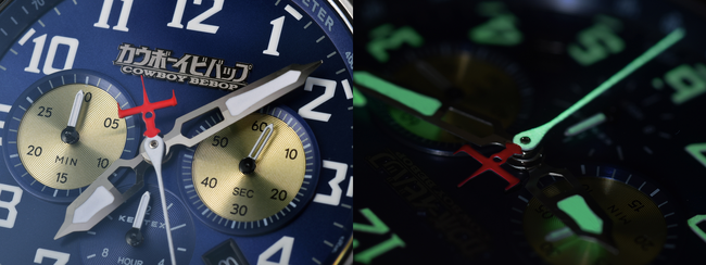 ビバップ号からインスパイアされた時分針と共に、クロノグラフ秒針のテール部にはソードフィッシュIIがデザインされ、ディテールまで『カウボーイビバップ』の世界観に溢れる仕様。