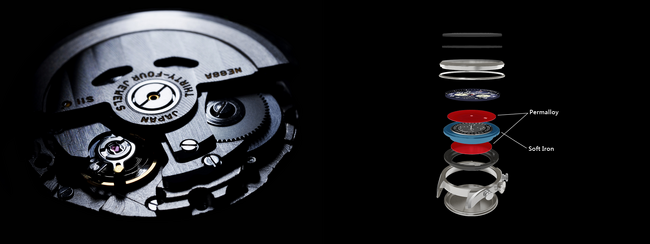 本モデルは、プレミアムウォッチに相応しい国産のSEIKO NE88 機械式クロノグラフムーブメントを搭載。28,800振動、垂直クラッチ伝達の駆動方式は、機械式クロノグラフの頂点を極めた仕様。また本モデルのケースは、電磁波などの磁力からムーブメントを守るために超耐磁構造となっており、耐磁性素材の軟鉄とパーマロイでムーブメントを覆う構造により、100,000A/m(約1200ガウス)という驚異的な耐磁性を実現。宇宙を股にかけるスパイクの世界観を、機能面から最高のテクノロジーで再現している。