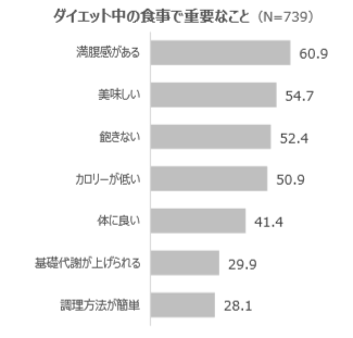 ダイエット中の食事ではどういったことが重要だと思うか聞いたところ、最も多かった回答は「満腹感がある」で60.9%、次に「美味しい」の54.7%、「飽きない」の52.4%と続きました。普段よりも食事の量や食べられるもの、間食が減るダイエット時期、食事の味や満腹感は重要な要素と考えられます。