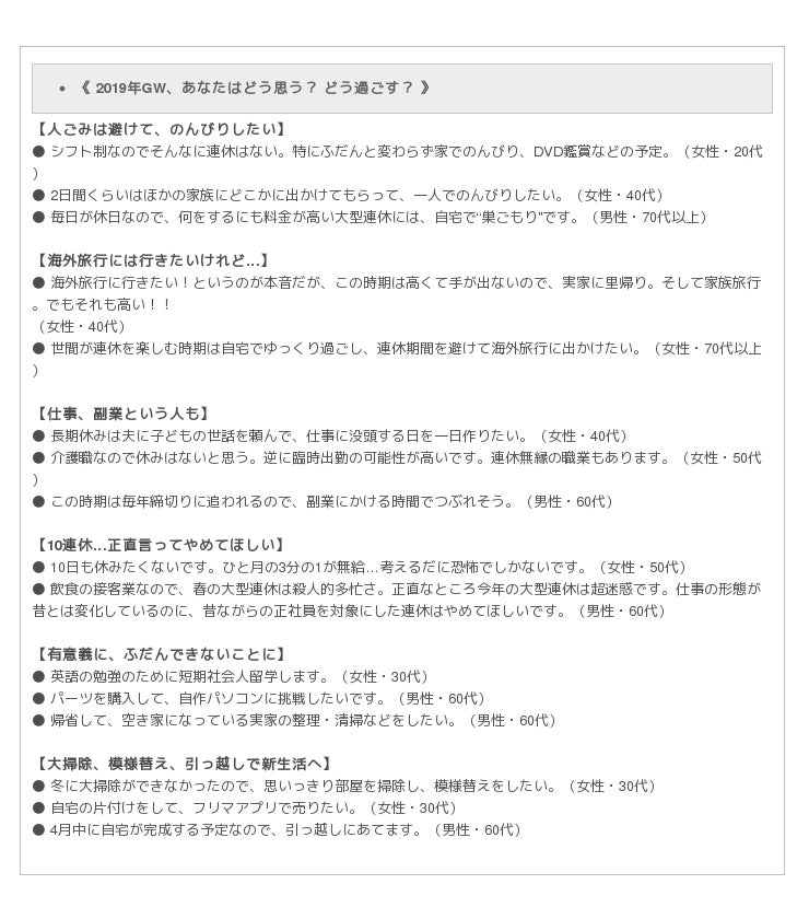 2019年春の大型連休の過ごし方や連休について思うことを、自由に答えてもらいました。連休は混むし高いし、外出は控えてのんびりしたい…と、アンケート結果を裏打ちするような回答が続々。そんな中でも、模様替え、引っ越しなど、新元号とともに生活を一新させる人もいるようです。寄せられた回答を読んでいるとお金をかけなくてもできることがありそうな気がしてきました。めったにない長期休暇、あなたも新しい何かにチャレンジしてみては?