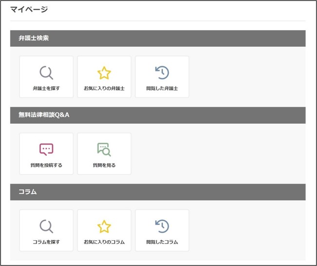 マイページでは、気になるコラムや法律事務所の情報をお気に入り登録することが可能です。同じログイン情報で、離婚・労働問題・交通事故・相続・刑事事件・債務整理・債務回収・ITの8つの分野の弁護士ナビシリーズに対応しています。また、従来は弁護士ナビシリーズのサイトごとに会員登録が必要だった “無料法律相談Q&A”についても、ひとつのログイン情報で分野横断的にご利用頂けるようになります。