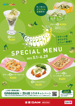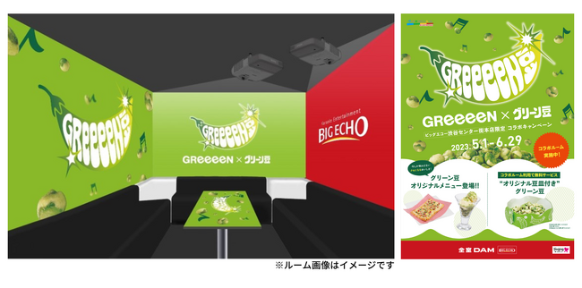 GReeeeN×グリーン豆 コラボレーション企画の1つとして音楽を通してグリーン豆をお楽しみいただきたいとの想いから、株式会社第一興商が運営するカラオケルーム ビッグエコーとタイアップした「グリーン豆コラボルーム」を開設します。お部屋は今回のキャンペーンのシンボリックデザインである“GReeeeN豆”ロゴをモチーフに装飾し、コラボルームをご利用のお客様には、「オリジナル豆皿付きグリーン豆」をプレゼントします。* また、グリーン豆を用いたピザ、おつまみ、アイスなどのスペシャルメニューを、コラボメニューとして同店限定で販売します。