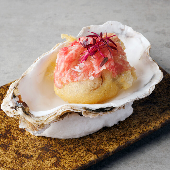 【前 菜】 真牡蠣のフリット 霜降り肉と共に マルドンの塩