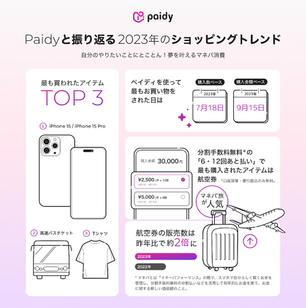 あと払い(Buy Now Pay Later)サービス「ペイディ」を提供する株式会社Paidyは、このたび、ペイディのお客様の2023年のお買い物トレンドをまとめましたのでご報告します。2023年は、新型コロナウイルスの規制緩和により、本格的なアフターコロナを迎え、旅行やお出かけなどの需要が高まりを見せました。
