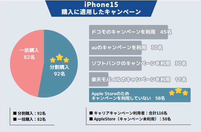 キャリアで購入することのメリットは買い替えキャンペーン※適用によりAppleStoreよりも安くiPhone15シリーズが利用できること。アンケート結果でも、キャリアのキャンペーンを利用している116名のうち、92名が分割購入をしており、買い替えキャンペーンの需要の高さが窺えます。