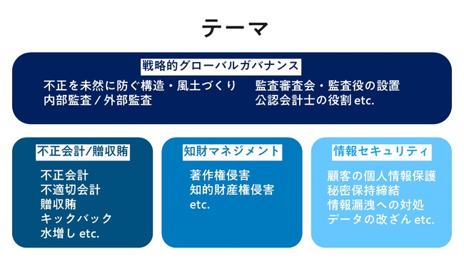 「戦略的グローバルガバナンス」「不正会計/贈収賄」「知財マネジメント」「情報セキュリティ」から、それぞれの課題を具体的に詳説し、海外事業においてコンプライアンスを遵守するために"誰がどのような行動をとるべきか"、課題対策のアクションを明確化します。