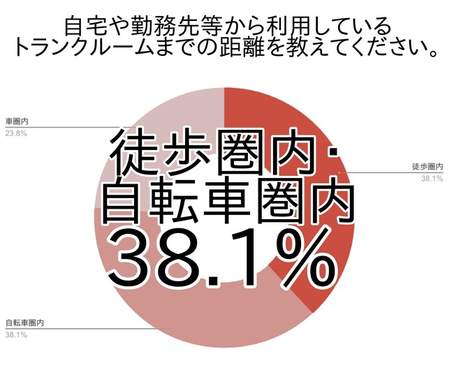 アンケートでは、徒歩圏内・自転車圏内と答えた方が同率で38.1%でした。徒歩か自転車で10分以内の「ちょっとそこまで」という感覚で行ける距離のトランクルームが選ばれる傾向にあります。