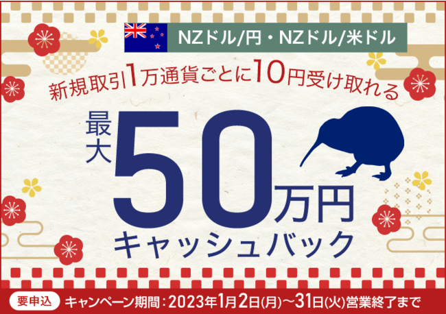 セントラル短資FX株式会社(本社:東京都中央区、代表取締役社長:松田 邦夫)は、2023年1月2日から 31日までNZドル/円とNZドル/米ドルの新規取引を対象としたキャッシュバックキャンペーンを実施します。