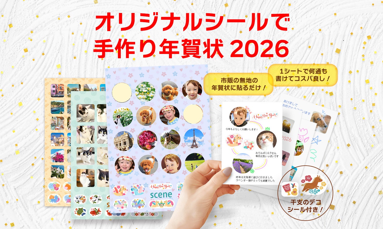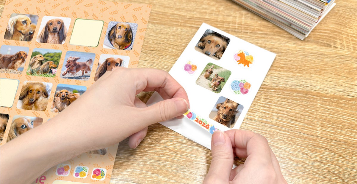 年賀フォトシールを使えば、市販の無地年賀状に貼るだけで、誰でも簡単に華やかな年賀状を作成できます。