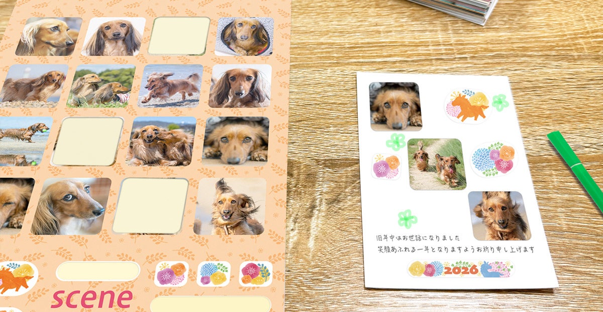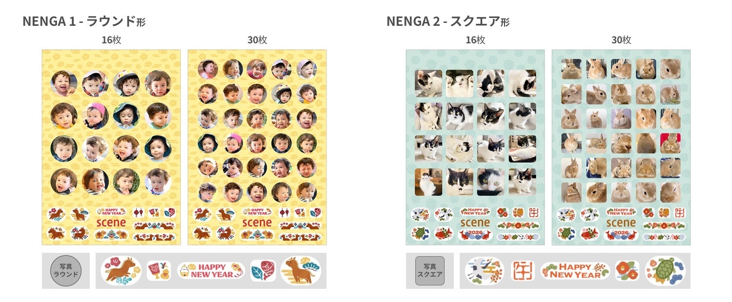 Sceneアプリから注文できる季節限定販売の「年賀フォトシール」は、台紙部分に干支や吉祥文様を描いた特別なデザインで、イラスト部分もはがして貼ることができる年賀状向けのシール商品です。