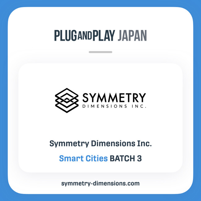 Symmetry Dimensions Inc.(本社:米国デラウェア州、代表:沼倉正吾、以下シンメトリー)は、Plug and Play Japan株式会社(本社:東京都渋谷区、代表取締役社長:ヴィンセント・フィリップ、以下Plug and Play Japan)が主催するスマートシティ領域のオープンイノベーションを促進するアクセラレータープログラムにおいて、第3期プログラム「Batch 3」のスタートアップ企業に採択されました。本プログラムは、国内外25社のスタートアップと18社の企業パートナーが参画し、東京・大阪の2拠点で実施されます。