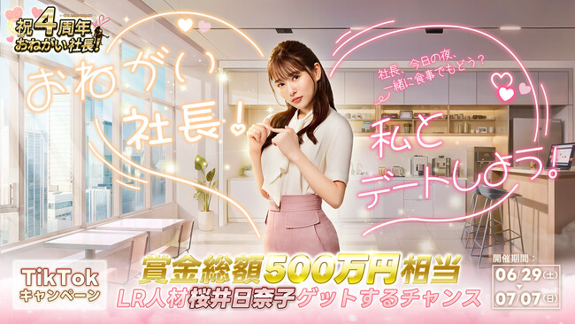 TikTokで開催する4周年記念イベントでは、イベントページ上の特定の任務を完了すると抽選に参加できるポイントを獲得し、抽選のチャンスが与えられます。Amazonギフト券、限定LR人材桜井日奈子さん、無料100連LR人材ガチャ券など総額500万円以上の豪華な賞品を用意しています。