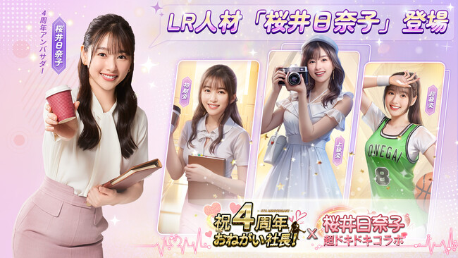4周年限定LR人材として桜井日奈子さんがOL(初期姿)、私服(上級姿)、バスケットボールのユニフォーム姿(超級姿)の3形態でゲーム内に実装されます。