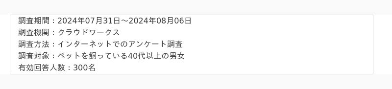 そこで今回林商会では、40代以上のペット飼い主300名を対象にアンケート調査を実施しました。また、みなさんのペットに対しての思いや行なっている対策についても調査したので、ぜひご覧ください。