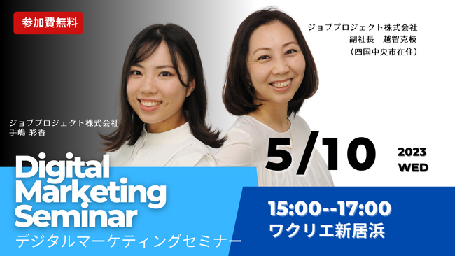 ハタラクをつくる、楽にする、楽しむソリューションを提供するジョブプロジェクト株式会社(本社:東京都新宿区、代表取締役:鈴木 貴大 https://job-project.com/ 以下、ジョブプロ)では、この度、「<ワクリエ新居浜多目的室> デジタルマーケティングセミナー」と題し、愛媛県新居浜市ワクリエ新居浜にて2023年5月10日(水)15:00よりセミナーを開催いたします。尚、主催はハートネットワーク、共催はジョブプロジェクト株式会社での実施となります。