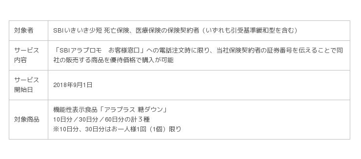SBIいきいき少額短期保険株式会社(本社:東京都港区、代表取締役社長:高?誠治、以下「SBIいきいき少短」)とSBIアラプロモ株式会社(本社:東京都港区、代表取締役社長:竹崎泰史、以下「SBIアラプロモ」)は2018年8月31日より業務提携し、SBIいきいき少短の契約者の健康をサポートする新しい取組みとして、SBIアラプロモの販売する商品を割引価格で提供する優待サービスを開始することをお知らせします。