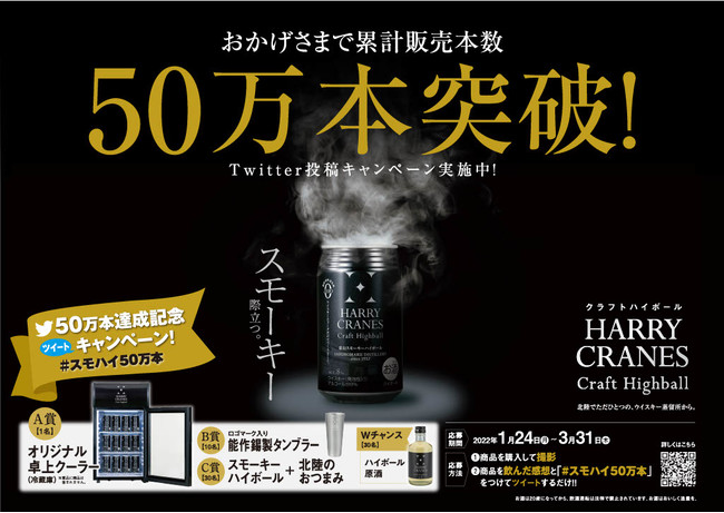 若鶴酒造株式会社(本社:富山県砺波市三郎丸、代表取締役社長:小杉康夫)が2019年3月25日に発売した自社のウイスキーを使用した本格的なハイボール缶「HARRY CRANES Craft Highball(ハリークレインズ クラフトハイボール)富山スモーキーハイボール」は、累計販売本数が2021年12月に50万本※を突破しました。