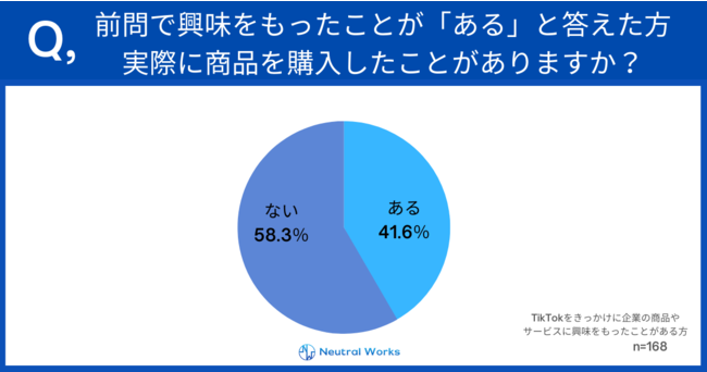 前問で、TikTokをきっかけに企業のサービスや商品に興味をもったことが「ある」と答えた方の内、実際に商品を購入したことがあるのは41.6%と高い数値となりました。