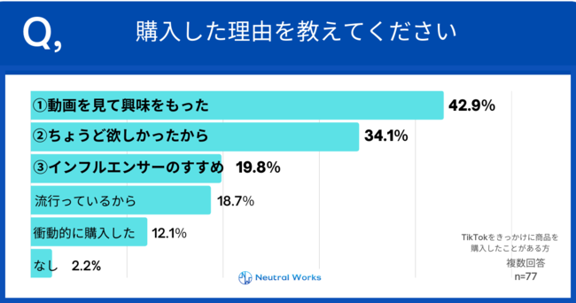 TikTokをきっかけに商品を購入したことがあるユーザーの購入理由として、1位は「動画を見て興味をもった(42.9%)」という結果となりました