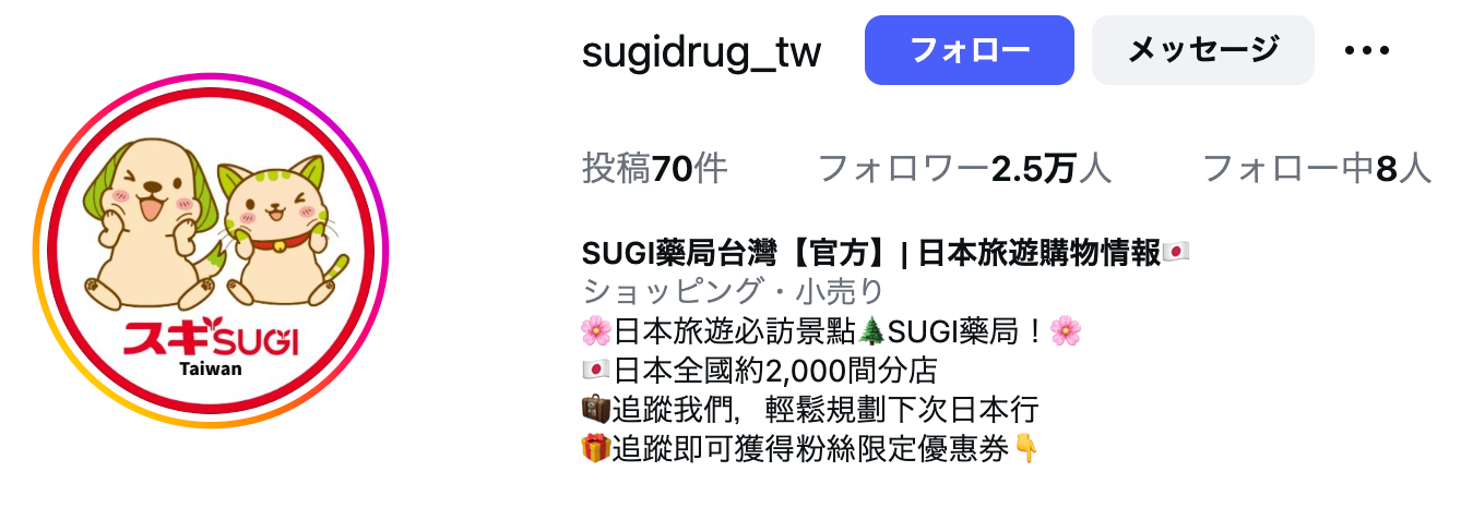 アカウント:https://www.instagram.com/sugidrug_tw/