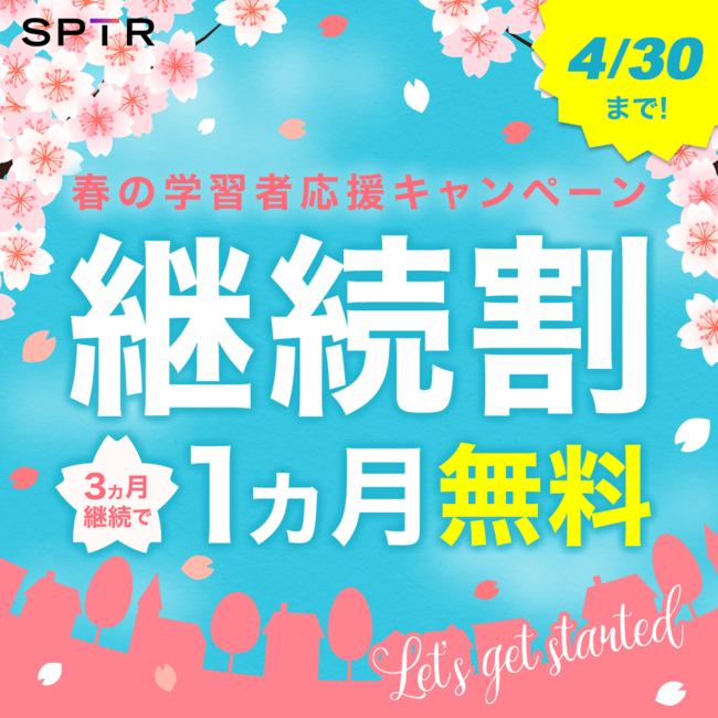 英語の習得で欠かせないことが継続することです。スパトレで学ぶ学習者の皆様は、適正や、スタート時のレベル、学習への取り組み方などによって成果が出るスピードは学習者毎に異なりますが、およそ3カ月でCEFR1レベルアップいただいております。まずは1レベルアップを目指し3カ月の継続を後押しする継続割で、新年度に英語のスキルアップにチャレンジする方々を応援すべくキャンペーンを実施いたします。