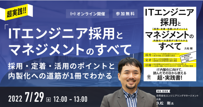 7月21日(木)に出版した久松剛氏 著書の「ITエンジニア採用とマネジメントのすべて~採用・定着・活躍のポイントと内製化への道筋が1冊でわかる~」。その発売を記念して、セミナーを開催することとなりました。