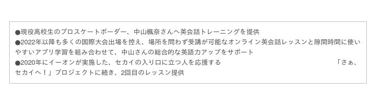イーオンは「英語教育を通してお客様の人生を豊かにし、世界で活躍できる人材を育成すること」を使命にかかげ、英会話教室運営やオンラインレッスン事業、企業・自治体・学校法人への研修等を行っています。2020年には「英語を学んで世界に挑戦したい」という目標を持つアスリートの英会話トレーニングを支援する「さあ、セカイへ」プロジェクトを開始し、中山楓奈さんへ4ヶ月間の英会話レッスンを提供しました。