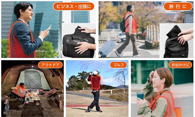 ビジネスシーンからアウトドア、お出かけ、お買い物、出張、旅行、ゴルフ、釣り、ツーリング、屋外作業など、様々な場所や場面で活用できます。