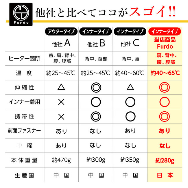 当製品は、ヒーター箇所、温度帯、伸縮性、携帯性、軽量性などの面において徹底的にこだわり、アウタータイプや他社製品に比べて使い勝手に優れたデザインと機能を提供します。