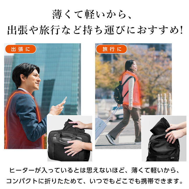 アウタータイプの電熱ベストやウェアは、「脱ぎたくなるけれど荷物になる」「カバンやリュックに収めにくい」という悩みを抱えることがあります。