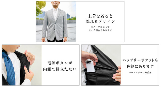 そのため、ビジネスシーンやファッションの邪魔をすることなく、電熱ベストを体感することができます。
