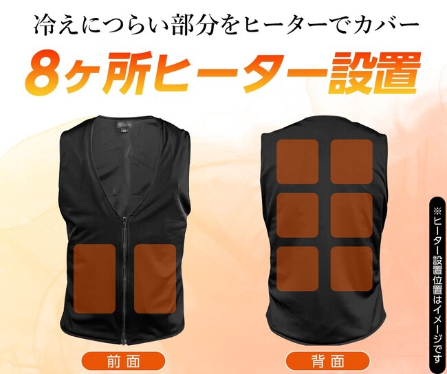 寒い季節において、体感温度が低下しやすい肩、背中、腰、腹部などの要所に、合計8ヶ所にわたってヒーターが配置されています。