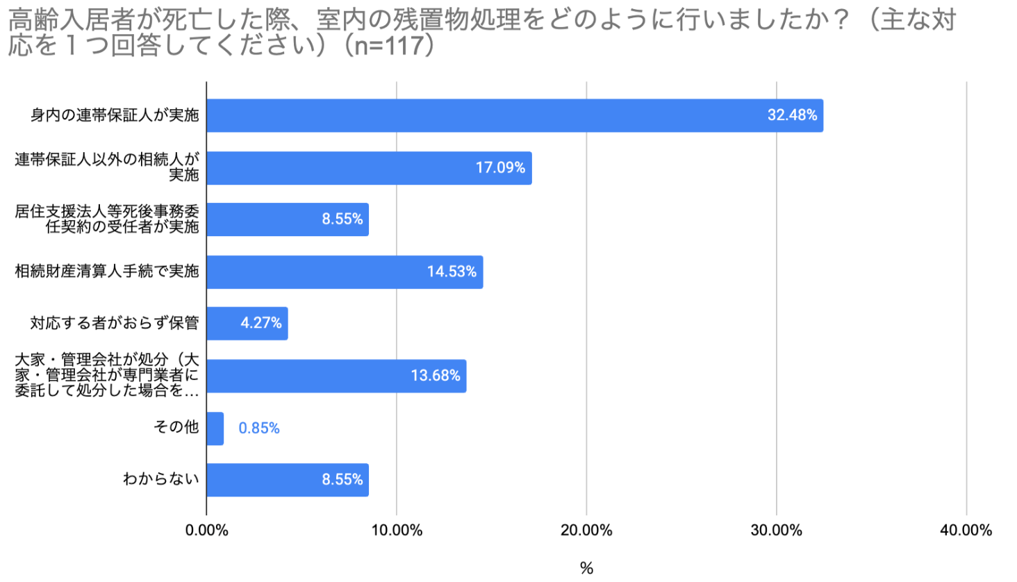 その117名に対し、「死亡時の室内の残置物処理をどのように行ったか」を聞いたところ、「身内の連帯保証人が実施」が最も多い32.5%(38名)となりました。また、「居住支援法人等、死後事務委任契約の受任者が実施」した場合は8.6%(10名)、「大家・管理会社が処分(専門業者への委託を含む)」した場合も13.7%(16名)あることがわかりました。