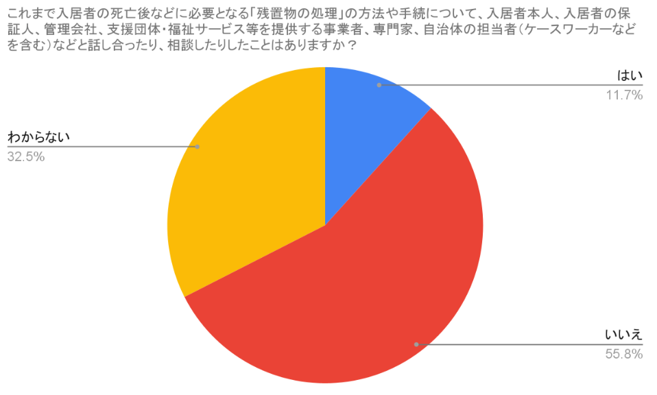入居者の死亡後などに必要となる「残置物の処理」の方法や手続について、入居者本人や保証人、管理会社、支援団体・福祉サービス事業者、専門家、自治体担当者などと話し合ったり相談した経験の有無を尋ねたところ、「はい」と回答した方が11.7%(117名)、「いいえ」が55.8%(558名)、「わからない」が32.5%(325名)となりました。