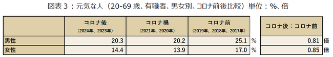次に男女別の元気な人を比較していきます。男性は、コロナ前が25.1%、コロナ禍が20.2%、コロナ後が20.3%に、女性は、コロナ前が17.0%、コロナ禍が13.9%、コロナ後が14.4%という集計結果になりました。コロナ前後で比較をすると、男性が4.8%減少(約0.81倍)、女性が2.6%減少(約0.85倍)となり、コロナ前後ではより男性で元気な人が減少しています。