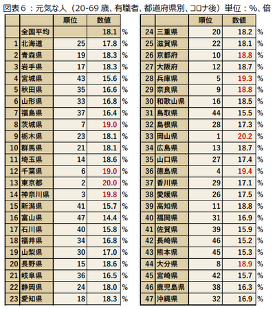 ■有職者で元気な人の多い都道府県は1位岡山県、2位東京都、3位神奈川県