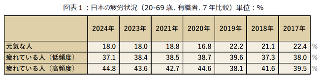 一般社団法人日本リカバリー協会(事務局:神奈川県厚木市、代表理事:片野秀樹)は、一般社団法人日本疲労学会、株式会社ベネクスと共同で、2017年から全国10〜14万人(20〜79歳 、男女各5〜7万人)に対して行っている健康及び生活状況に関するインターネット大規模調査「ココロの体力測定」を、2024 年4 月25日から5月30日に実施。その結果から有職者の方々から「元気な人」、「疲れている人(低頻度)」、「疲れている人(高頻度)」を抜粋、2017年からの過去データを活用し、コロナ前からコロナ禍、コロナ後の「有職者の疲労状況」の推移をまとめました。