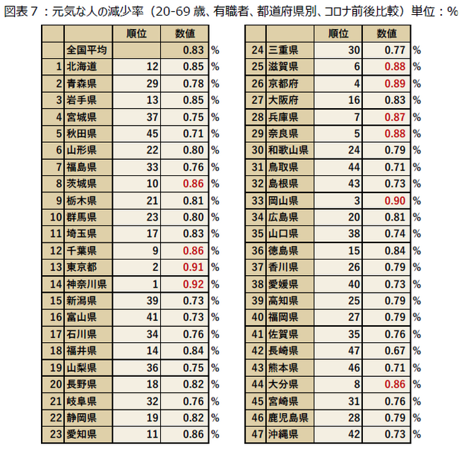 元気な人の減少率が少なかったのは、1位が神奈川県、2位が東京都、3位が岡山県