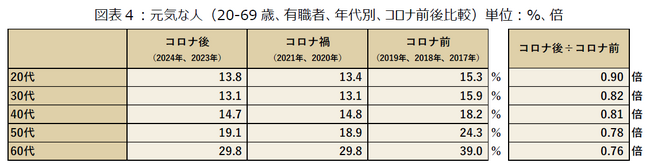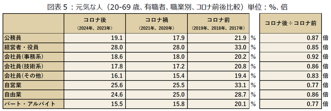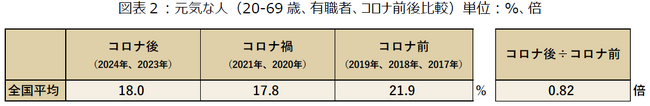 有職者の元気な人をコロナ前後で比較すると、コロナ前(2019年、2018年、2017年)が21.9%、コロナ禍(2021年、2020年)が17.8%、コロナ後(2024年、2023年)が18.0%という集計結果になりました。コロナ前後で比較をすると、3.9%減少(約0.82倍)しています。